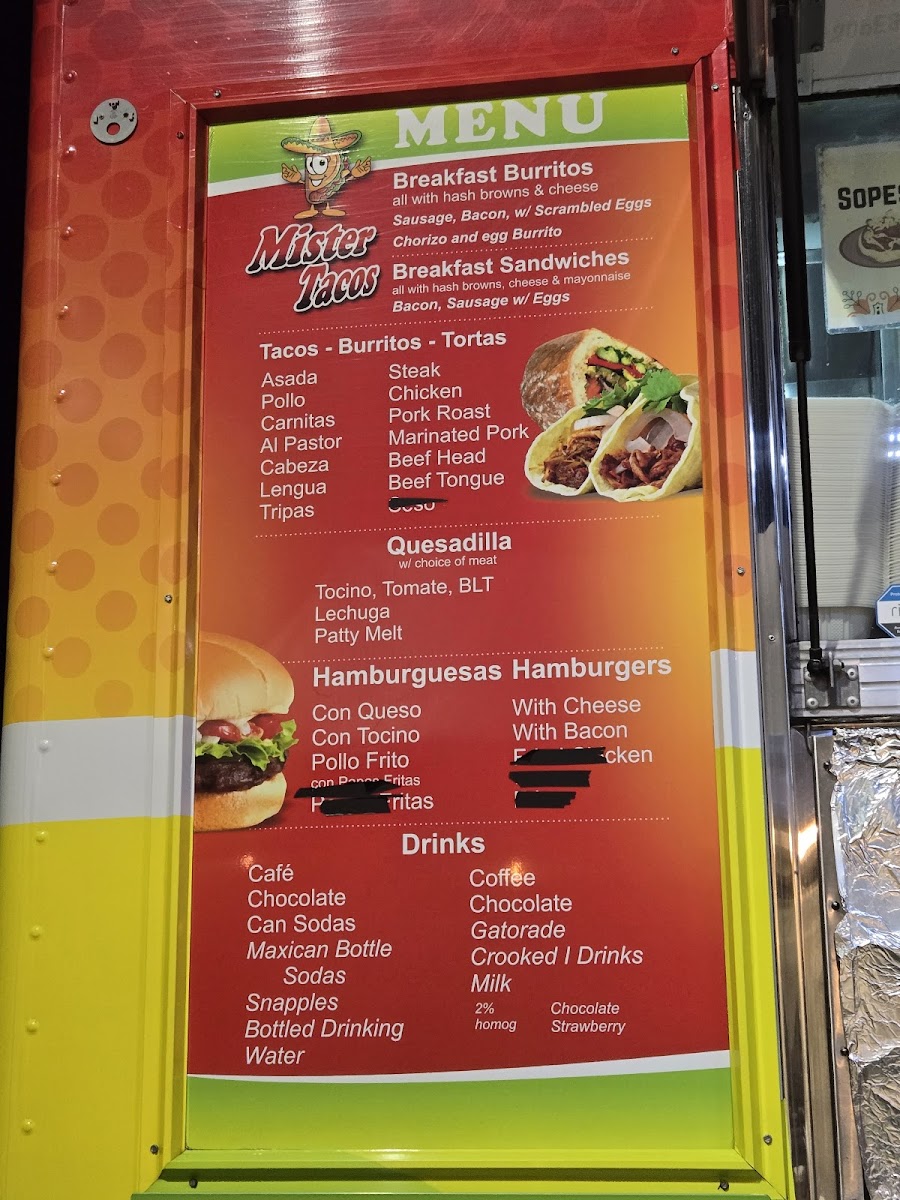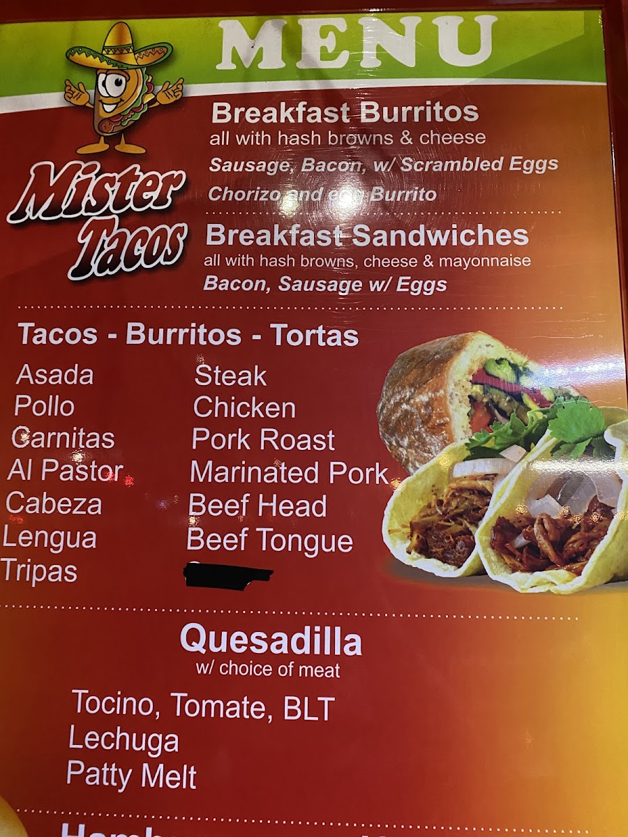 The menu at Mister Tacos LLC offers a straightforward, casual selection inspired by authentic Mexican street food. It’s designed for those looking to enjoy familiar favorites like tacos, burritos, and tortas in a relaxed setting, perfect for a quick lunch, a casual dinner, or a laid-back weekend breakfast.